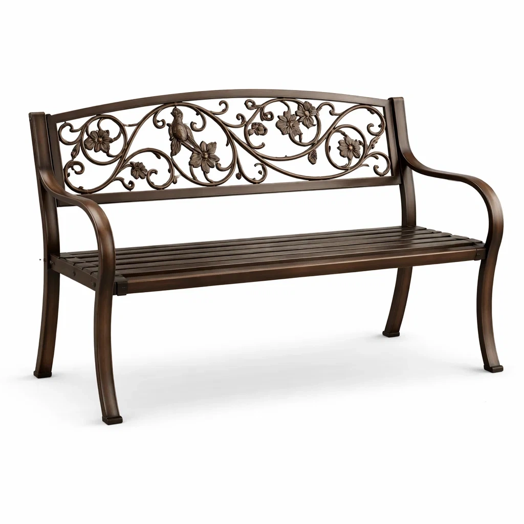 La struttura è progettata con un design arricchito da decorazioni floreali. La panchina è resistente alle intemperie e necessita di assemblaggio.