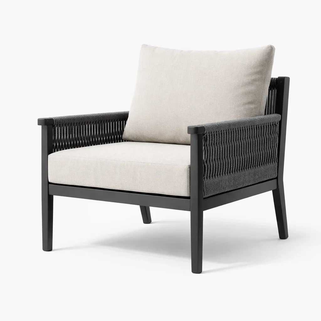 Materiale: Struttura in alluminio, seduta in corda intrecciata, cuscini in tessuto poliestere