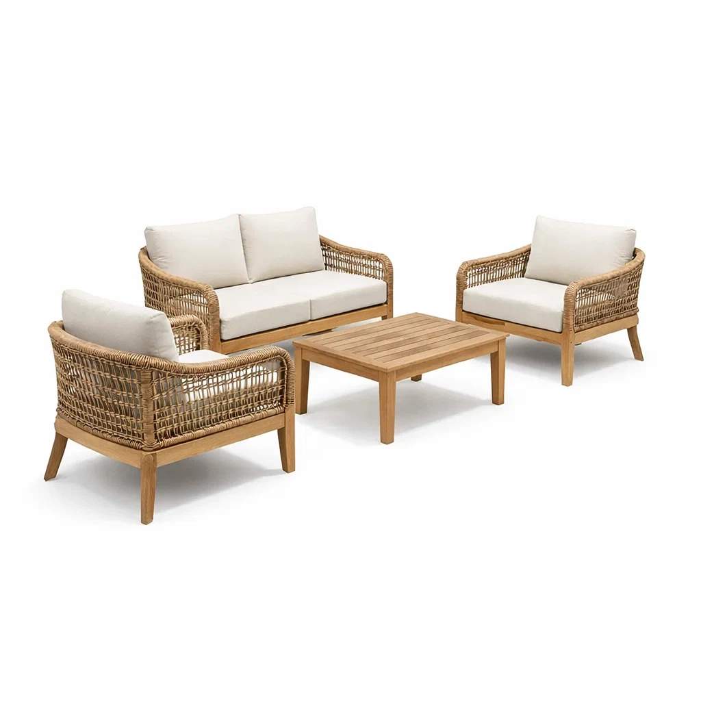 Materiale: Struttura in legno di teak, rivestimenti in rattan sintetico, cuscini in tessuto di poliestere