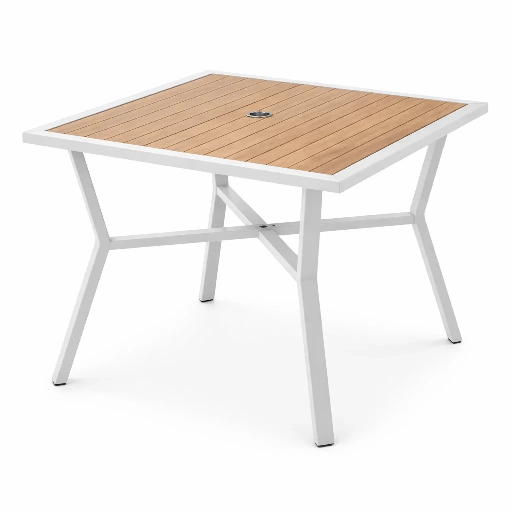 Dettagli di design: Tavolo quadrato con foro centrale per ombrellone